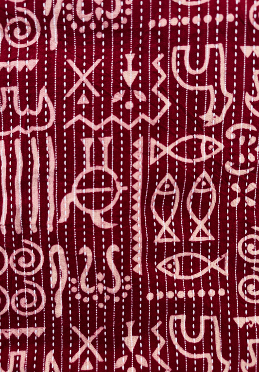 Deep Red Kantha Stitch Tribal Fabric with Symbolic Patterns