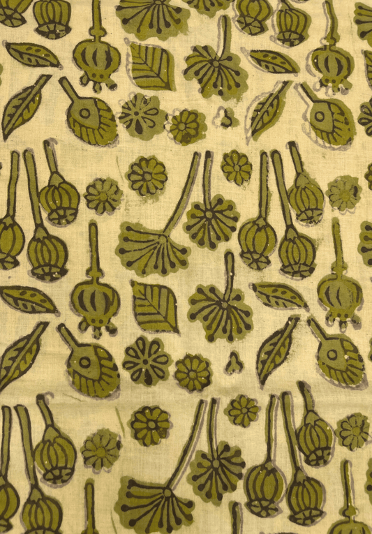 Hand Block Printed Vanaspati Cotton - Olive Green Motifs