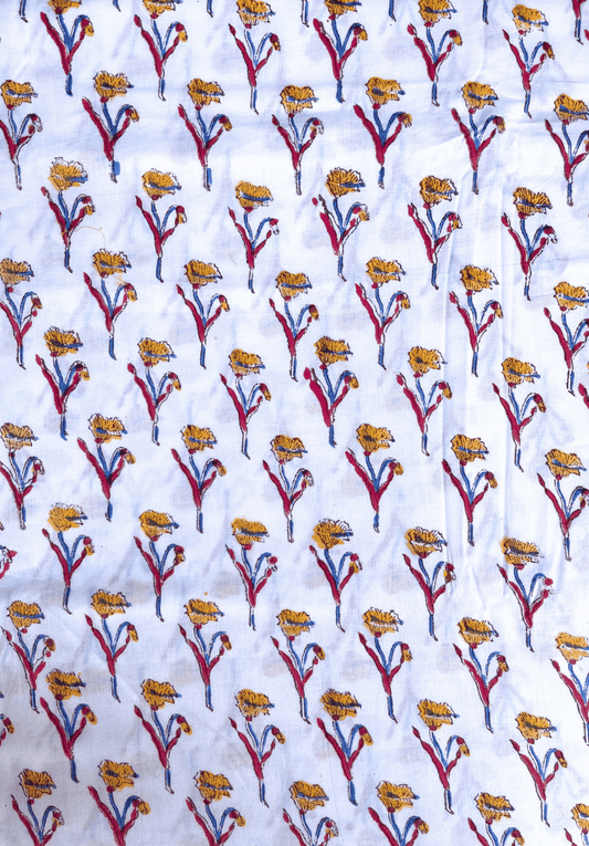 Hand Block Print with White Base with Floral Motifs in Red, Blue & Yellow