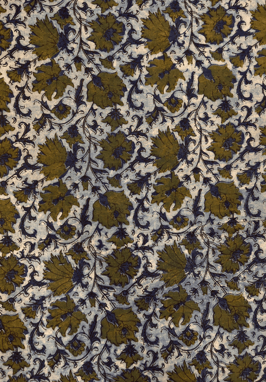 Hand-Printed Vanaspati Cotton Fabric Intricate Blue & Olive Green Botanical Textile