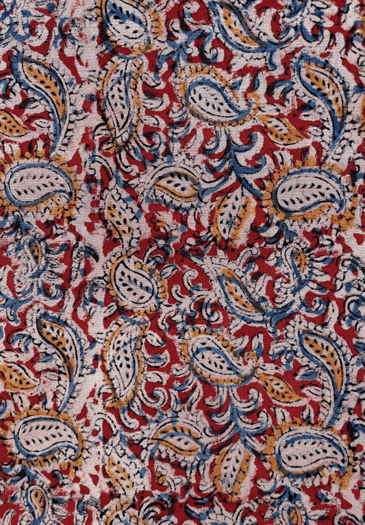 Regular price From Rs. 350.00Regular priceUnit price / perSale price From Rs. 350.00Paisley Kalamkari Print on Red Fabric with Blue and Mustard Accents