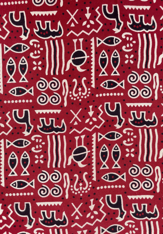 Symbolic Motif Ajrakh Rayon Fabric - Red, Black, & Cream
