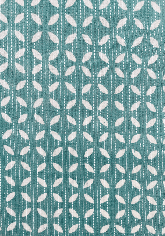 Teal Kantha Stitch Fabric with Leaf Pattern