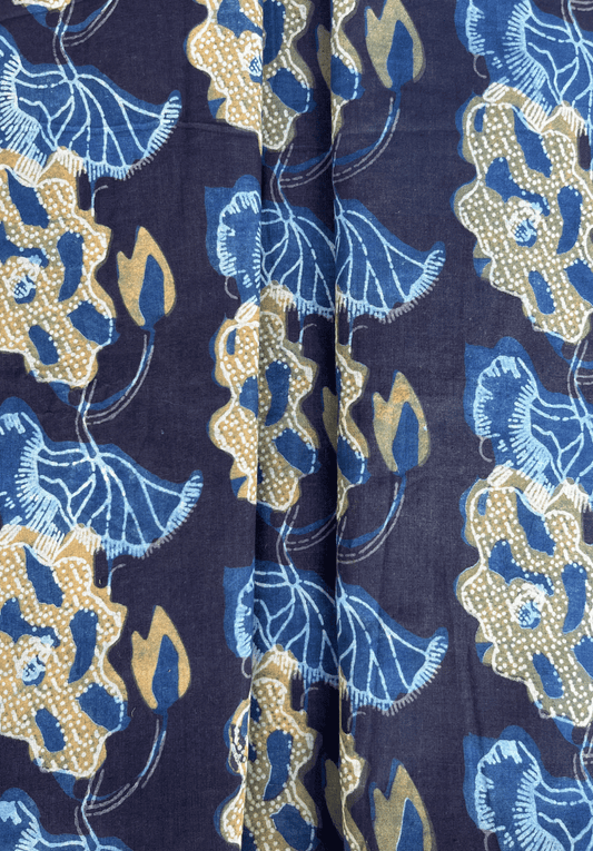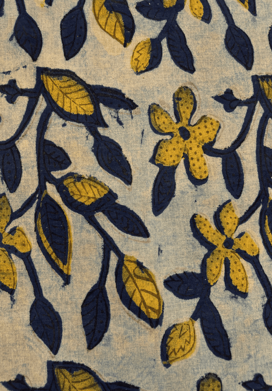 Regular price From Rs. 390.00Regular priceUnit price / perRs. 520.00Sale price From Rs. 390.00Vanaspati Print Cotton Fabric – Navy Blue, Mustard Yellow & White Floral Hand Block Design