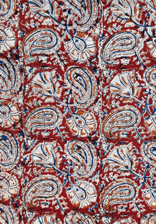 Regular price From Rs. 350.00Regular priceUnit price / perSale price From Rs. 350.00Traditional Paisley and Floral Kalamkari Print on Red Fabric with Blue, White, and Mustard Accents