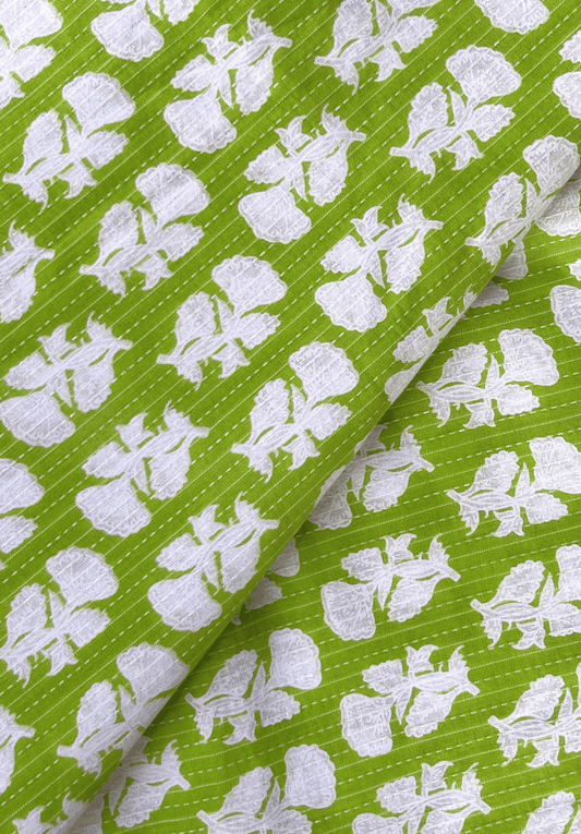 Vibrant Green Kantha Screen Print Pure Cotton Fabric