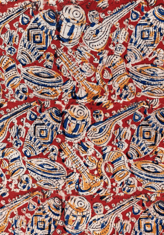 Regular price From Rs. 350.00Regular priceUnit price / perSale price From Rs. 350.00Vibrant Red & Indigo Musical Motif Traditional Kalamkari Fabric
