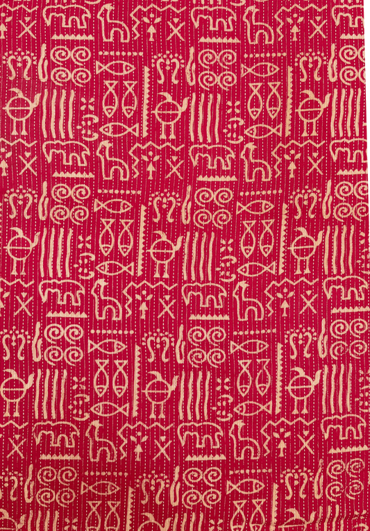 Deep Red Kantha Stitch Tribal Fabric with Symbolic Patterns