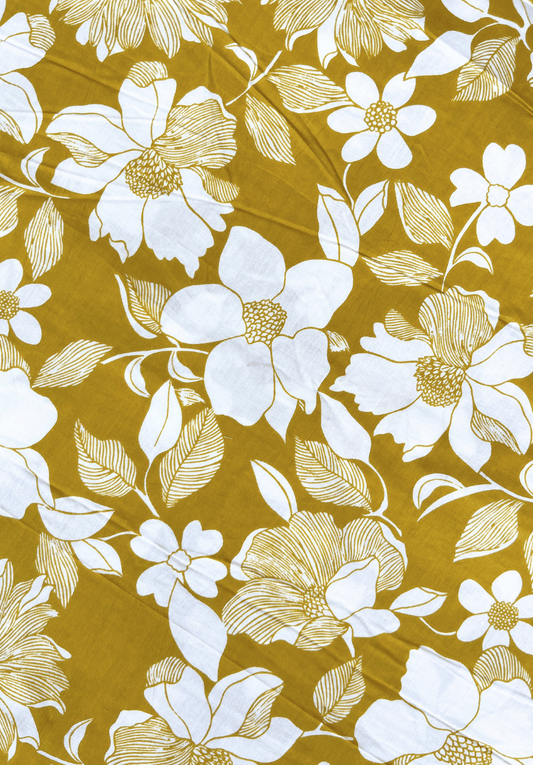 Mustard Yellow White Floral Screen Print Pure Cotton Fabric