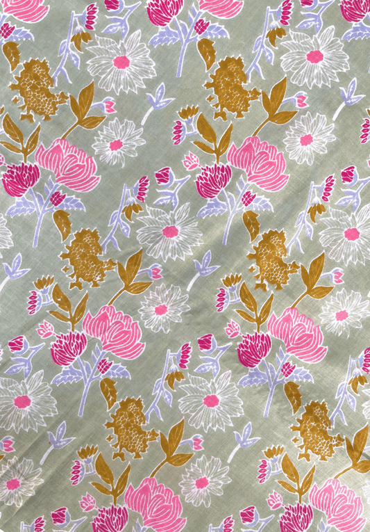 Regular price From Rs. 280.00Regular priceUnit price / perRs. 350.00Sale price From Rs. 280.00Elegant Floral Screen Print Cotton Fabric in Soft Sage Green with Pink and Gold Accents